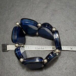 Pretty stretch bracelet has what looks like blue stones and silver beads. I think the bracelet has see-through plastic beads with something inside that makes it look like blue stones. It is a stretch bracelet, but it is on the smaller side so please check measurements prior to purchasing.