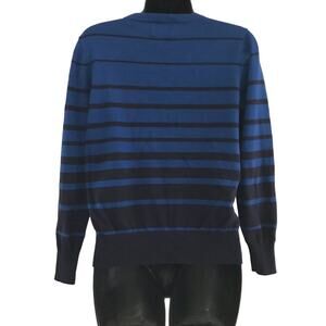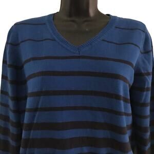 Blue and black striped petite medium sweater from St. John's Bay. Sweater has a v-neck and ribbed cuff sleeves with a cute graduated stripe pattern. Light weight, cotton and in excellent condition. No rips, stains or tears and comes from a smoke free home.