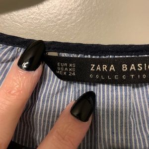 Layered flared sleeves, blue and navy, cropped at hip length-small hole pointed out in photo