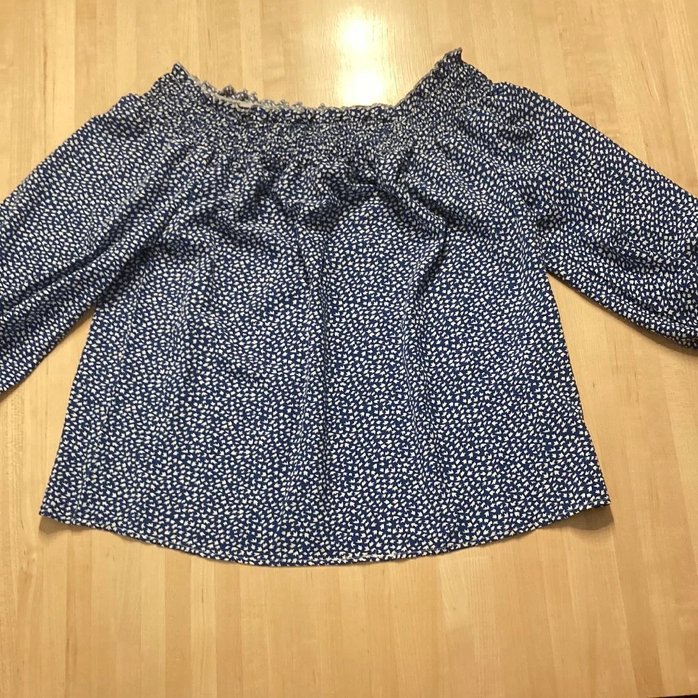 Off the shoulder women’s blouse. Navy blue base with white design. Fantastic condition, barely worn. Elastic too, almost 3/4 sleeves.