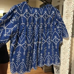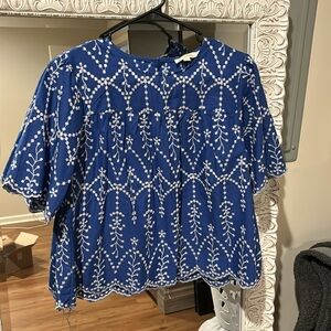 Blue short sleeve blouse with flower detail. Higher neck and keyhole back closure. Does have some threads that are coming undone at the top and bottom right hem. See photos. Size L fits more like a M.