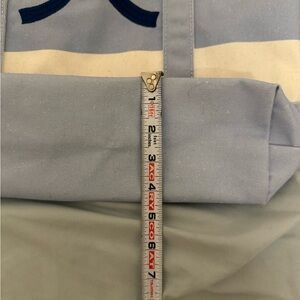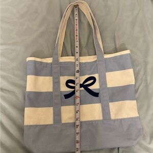 Blue bow canvas tote bag. Bow is only on one side of the bag. Never used so the outside is pretty clean. No inner pockets. Inside is a bit dusty but still clean.