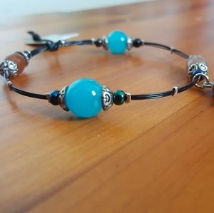 Precious bracelet by First and main with bright distinctive beads of turquoise blue and light brown along with beautiful clay cross. Diameter is relatively 2.5 inches.
