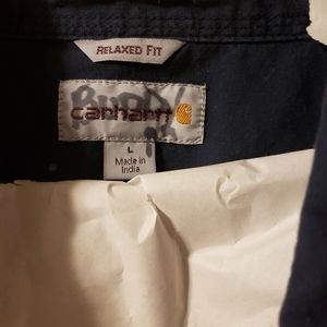 Lightly worn by Mr. BUDDY and well cared for. Dark blue, cotton, wooden buttons, breast pocket, short sleeve shirt
