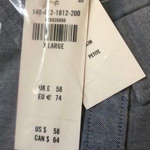 Blue button down with petite fit. Ordered the wrong size. Never worn.