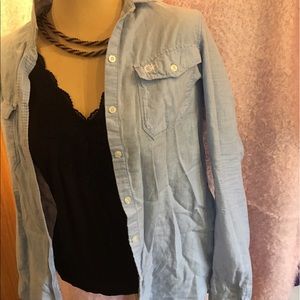 ๐ blue button front top ๐ค embroidered front pocket on left breast ๐ black top listed in my closet as well ๐ค sleeves can be worn down or rolled up ๐ M ๐ค gently used