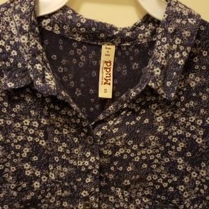 Dark blue soft button up with small flowers. High top in front, low swoop in back