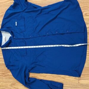 Blue button-down fishing shirt vented back roll-tab sleeves, Ocean + Coast XLT (Materials: 50% polyester, 50% recycled polyester)