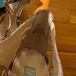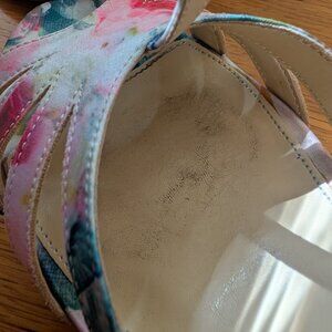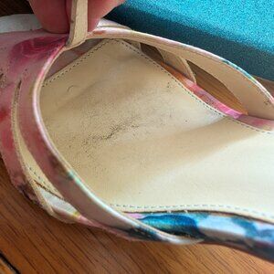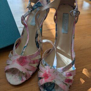 Lovely tea floral heels. Worn once at a wedding. Bottom pad scratched and shows wear from the day's event. Still in good condition.