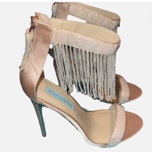 The Blue by Betsey Johnson Grand Champ Satin Size 8 heels are elegant and stylish, featuring a pointed toe and stiletto heel. The champagne color and fringed accents add a touch of sophistication to these formal shoes, making them perfect for weddings, parties, or christenings. Made with a combination of textile and satin/beads material, these ultra-high heels are a statement piece that can be worn year-round for various occasions. With a touch of glamour and a hint of luxury, these Betsey Johnson heels are a wardrobe staple for the fashion-forward woman.