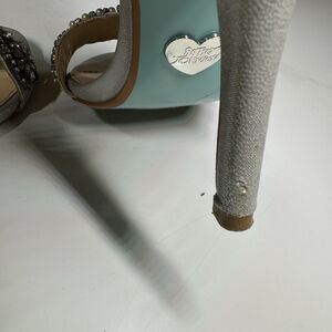 Step into glam with these Betsey Johnson silver heels, designed with a classic ankle strap and sparkling rhinestone and beaded embellishments across the toe. Perfect for weddings, proms, or evening parties, these dress sandals feature a 3.75 inch stiletto heel for a chic, elegant silhouette. The iconic turquoise sole with silver heart logo adds that signature Betsey touch. These open toe heels effortlessly combine modern sparkle with timeless style, making them the ideal bridal shoe or statement special occasion heel.