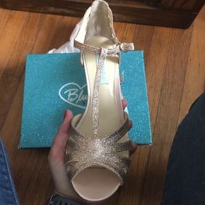 Worn once for a fitting but did not end up using for my wedding. They have sat in a box for 6 months. Very gorgeous shoes that could complete your something blue for your big day or just add some glitter to your wardrobe.