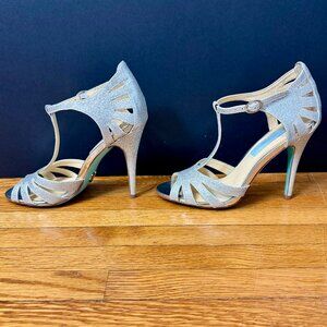 Blue by Betsey Johnson festive glittery silver T-strap stiletto heel glamorous evening / wedding / holiday / shoes / heels, Sz. 6