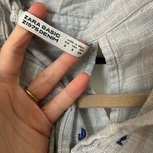 Lightweight shirt with button-up front. Features subtle blue accents. Ideal for layering, loose fitting