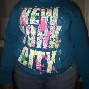 It's a cozy blue hoodie that says "New York" (purchased in New York) and has multi colored splattered paint on it. I am selling this for $35 but the price is negotiable.