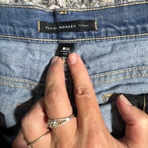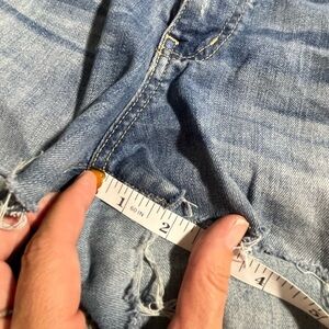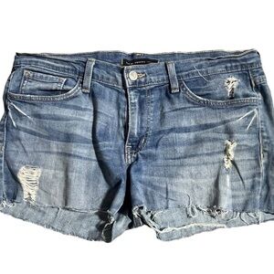 Blue denim shorts with distressed details, 5 pocket style, zipper and button closure, and raw hem.