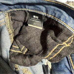Blue denim shorts with distressed details, 5 pocket style, zipper and button
