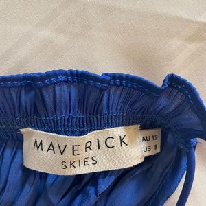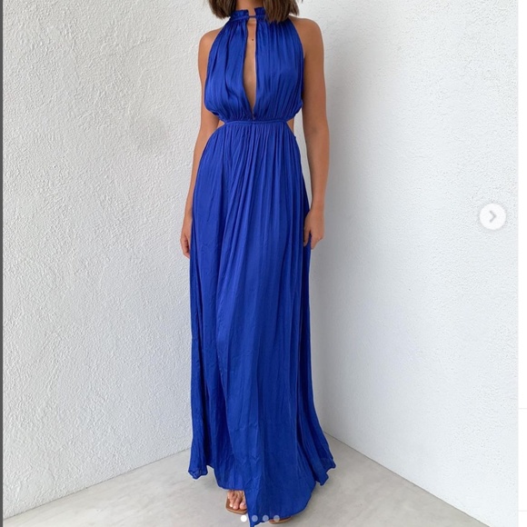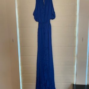 Blue maxi dress with front and back cut outs and ties. Light fabric with pleating.