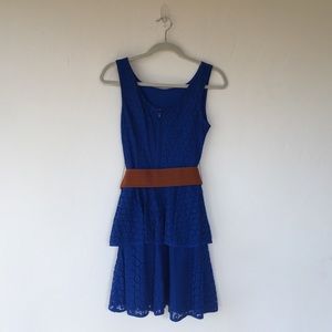 This dress is lined and comes with the belt shown which fits a small to medium person. Detailed with lace and has a layered skirt. Never worn
