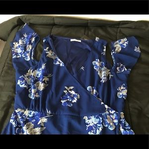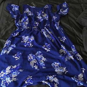 Blue summer dress with grey, white, light blue and navy blue flowers.