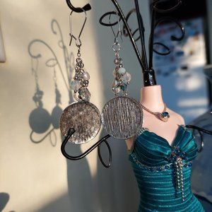 Mermaid earrings silvertone with blue druzy sparkle, blue, pearl and crystal beads. Dangle drops 3 inches. Stainless steel nickel free hypoallergenic J hook closure (as shown in last 3 photos).