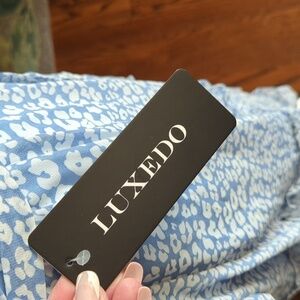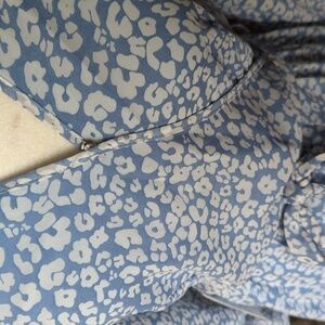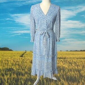 Blue floral print cross over neck Coquette Belted Tiered midi Dress NWT Sz S
