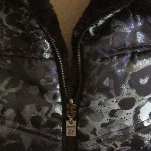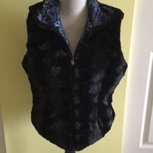 Blue floral reversible vest. Black faux fur on reverse side. Size Large, but tag cut off to wear it in reverse. Pockets on each side. Armpit to armpit 23 inches. Shoulder to bottom hem 24 inches. Worn once. Like new.
