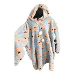 Blue fluffy sherpa like light brown teddy bear print oversized hoodie poncho blanket size OS new