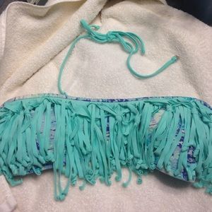 Teal fringe swim top with tie dye underneath. Size small. Comes with strap but can be worn without.