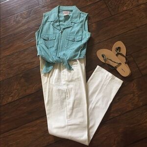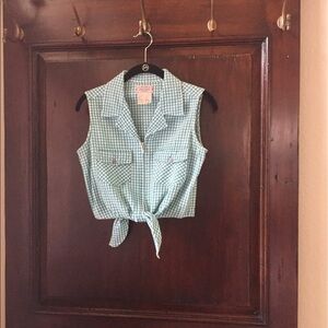 Cute teal blue crop top. Zippers down front with two front pockets and tie at waist. From at last jeanswear. Runs small.