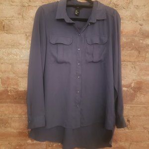 Versatile, size 4 blue gray button down shirt from H&M. I have worn this to the office tucked in with a dress pants or skirt or tucked out and dressed down with jeans. Back is slightly longer