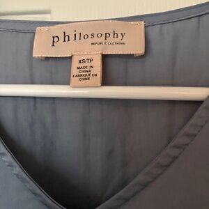 Philosophy blue/gray satin top. Super comfortable, soft, and breathable! Has cute ruffled sleeves and no flaws. Worn less than 5 times