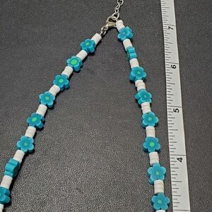 Pretty necklace has blue and green flower beads with white spacers. One flower has a crack - see photos.