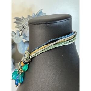 Blue, green & turquoise plastic bead hung on multiple cords. 16” long. This is vintage.
