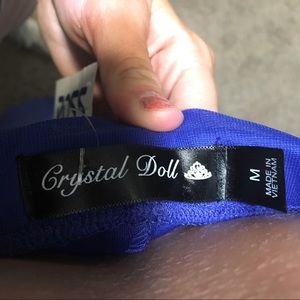 A dark blue strapless high-low prom dress with side beading. Fits curvey figures best and expresses ones curves.