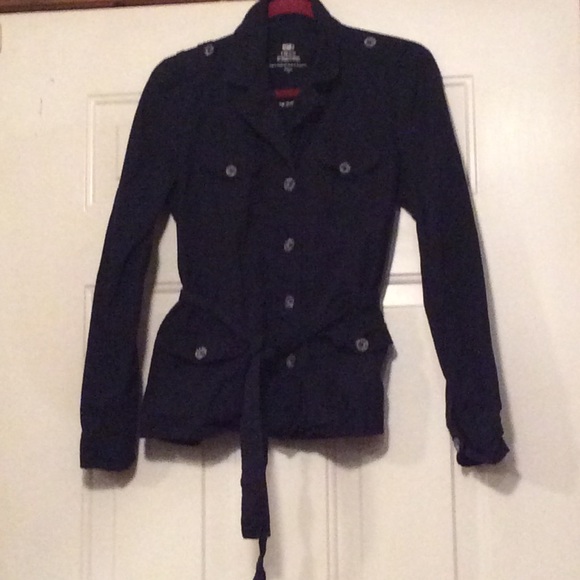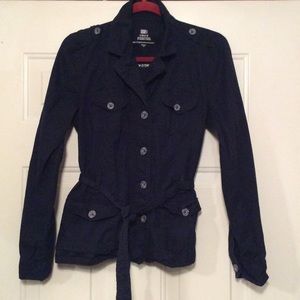 Blue jacket. This jacket can be worn like a blazer. 97% cotton, 3% spandex.