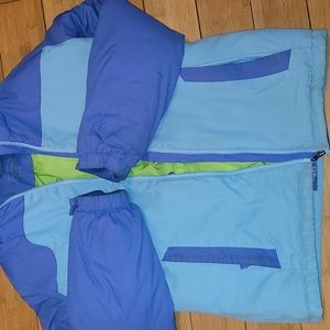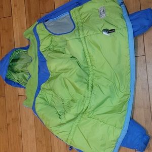 L.L. Bean 2 tone blue winter ski jacket with bright green inside. 1 inside pocket, 2 zippered outside pickets, inner waist drawstring and adjustable hood with option to stuff into collar and zip in or off. Elastic/Velcro cuffs, fleece lined neck. Child size 14/16. Freshly washed and ready for a new owner. front and cuffs show minor discoloration from normal wear. no holes or other issues. Smoke free home...super warm without being overly heavy