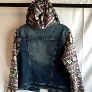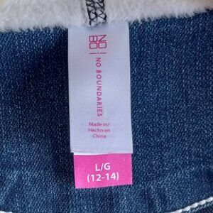Like New barely used string on hood still tied from factory. No Boundaries jacket for girls in size large. It features large brass buttons and a cotton hood, with a distressed blue color to the denim. Mid-length coat with long sleeves and is made from cotton, making it comfortable