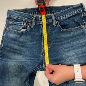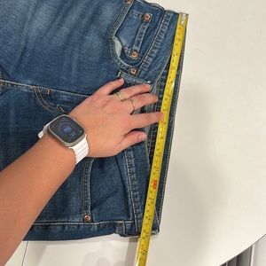Blue jeans it’s 99% cotton and 1% elastane and 15 inches across on the waist 17 1/2 at the hips and 9 1/2 rise