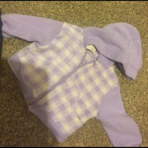 12 month old Blue jeans with gold pattern , fuzzy warm purple checkered 12 month old jacket.
