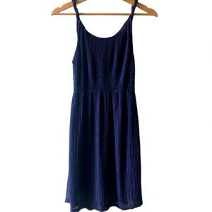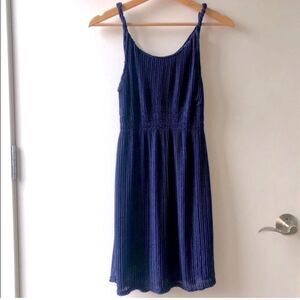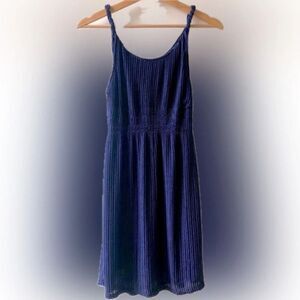 Navy blue knit like sleeveless mini to knee length sundress with twisted rope straps, size small/medium by SM Wardrobe found in good condition. Material has a nice sheen and lined with a satin like material. Super cute high waist is elastic and stretches for the perfect fit. Go corpcore by adding a blazer or cottagecore it with chunky wedges and a boho statement belt.