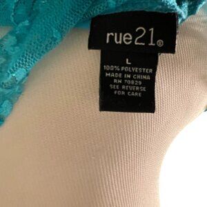 Cute, silky dress featuring a lace top and a peacock-embellished belt. Size large