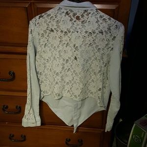 This button down is perfect for tying in the middle! The back is all lace and the sleeves are half lace half blue fabric. Great for that classic cute country girl look.
