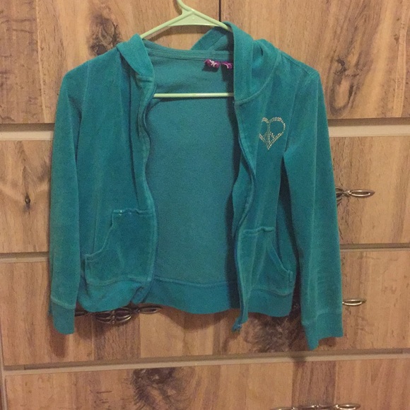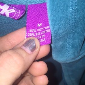 Soft blue jacket, has paint on one pocket and on one of the sleeves, peace sign heart on right chest