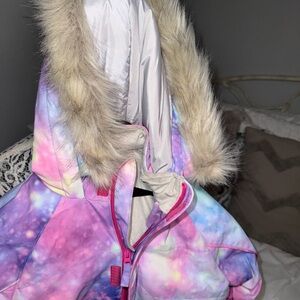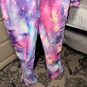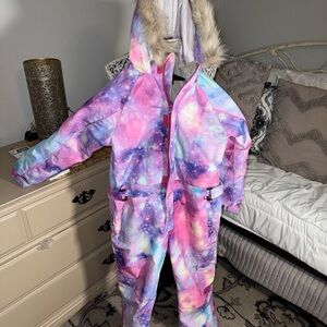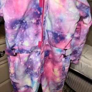 Vibrant and stylish pastel colors, Galaxy print theme, full body jumpsuit/snowsuit perfect for any outdoor snow, adventure or cold day occasion. Features a blend of pink, purple, and blue hues for a unique look. Warm and waterproof made for all day magical days in the snow or putting up with those bitter cold northern region weather EU size 140 is a size 10/11 US in excellent condition. Please see photos for measurements.