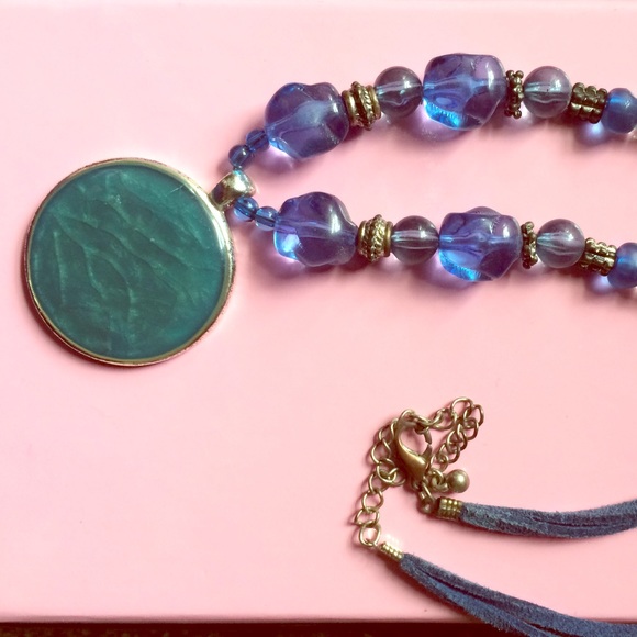 Half beaded Blue velvet cord necklace with a green/blue pendent. 12" length clasp is slightly worn necklace has never been worn