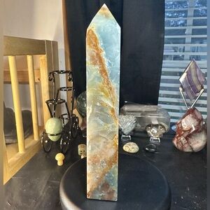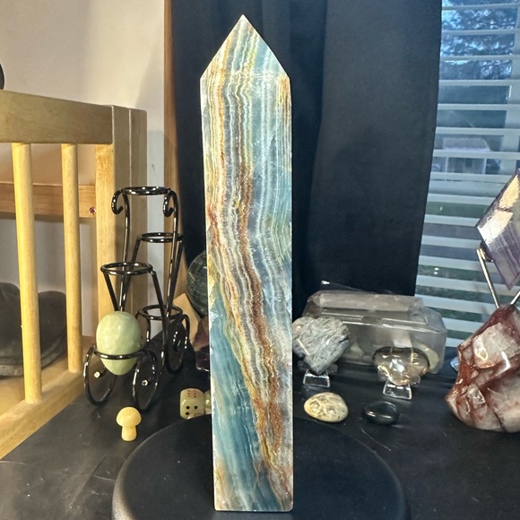 7in tall beautiful blue onyx aka blue aquatine Lumerian calcite. Beautiful blue color with gourgous brown banding.