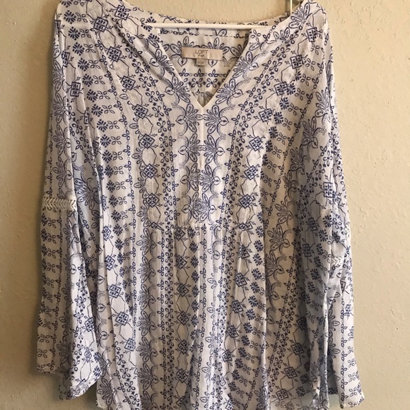 Blue and white patterned blouse. Lightweight, perfect for transitioning from summer to fall.