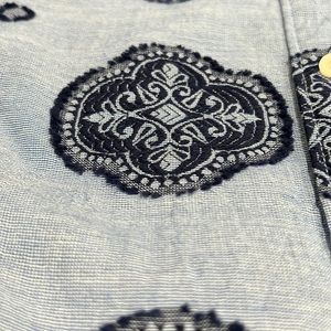 Blue patterned button down. Textured pattern. Buttoned sleeves. Slightly longer in back. Chambray look. Slightly oversized.