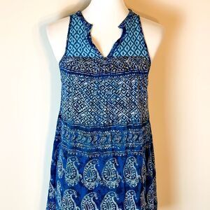 Blue Ecote sleeveless peasant style tunic with cute multi-pattern design, mini V neckline. Labeled size xs. Fits best of sizes xs-small (maybe some mediums due to the relaxed fit!)